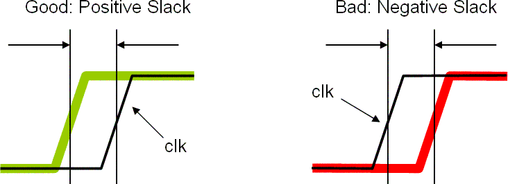 모든 함성이 끝난 후 지정된 constraint 대비 합성 결과를 비교하여 slack을 나타내게 되는데, 아래 그림처럼 지정된 것보다 일찍 신호가 도착하면 positive slack이라 하지요. 이런 경우 설계자로서는 행복한 순간이니 바로 호프집으로 가서 뒷풀이하면 되겠습니다.