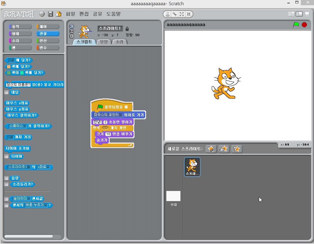 Scratch의 경우 최근에 어린이들에게 프로그래밍을 가르켜주는 과정들에서 가장 많이 언급되는 visual programming 환경입니다. 비교적 한글화도 잘 되어있고, 이전의 예제들도 풍부한 편이죠. 목적 자체가 교육용으로 만들어진거라 비교적 프로그래밍의 제어도 명확하고, 각종 변수들을 조합할 수도 있습니다.