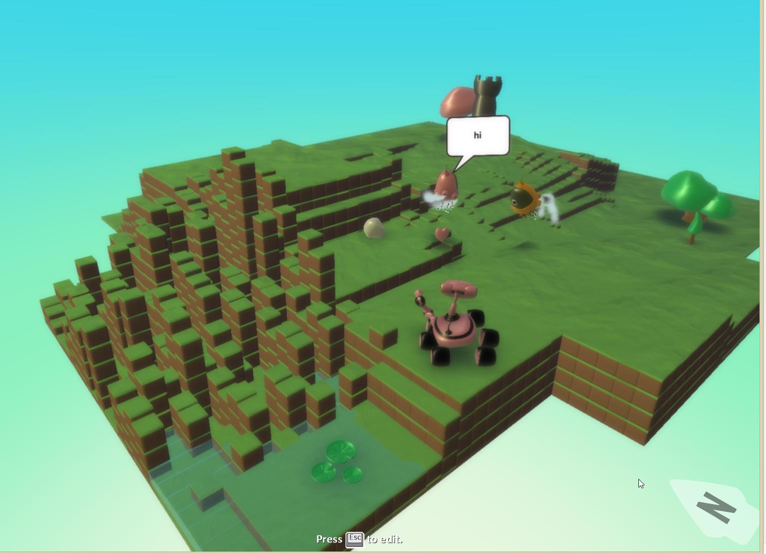 장점은 아래 스크린샷을 보시면 알 수 있듯이, 오랜 시간 들이지 않고도 그럴듯한 모양을 만들 수 있습니다. (프로그램 된 것은 핑크색 로봇 – 여기서는 Kodu라고 합니다.- 은 노란색을 따라가서 “Hi”라고 말하고, 노란색 Kodu는 핑크색을 보면 따라가도록 되어 있습니다.) 7살짜리가 잠깐 작업한건데, 그래도 왠지 그럴듯 해 보이죠?